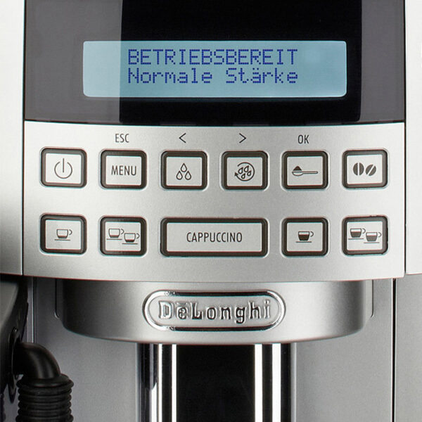 Compact bean-to-cup machine with the De’Longhi patented automatic cappuccino system: your perfect cappuccino at the touch of a button. Equipped with 2 text lines display with the possibility to customize your coffee as you prefer, cup holder and water filter.