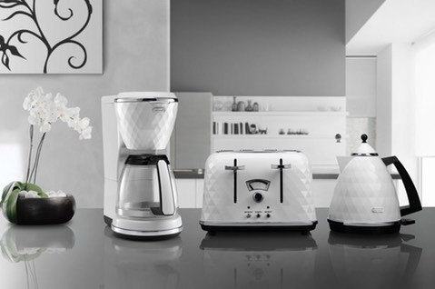 Pure jet black Brillante 10 cups drip coffee maker. A real piece of art in your kitchen, thanks to the three dimension design, the reflection of light from the round-cut body and the elegant chromed details